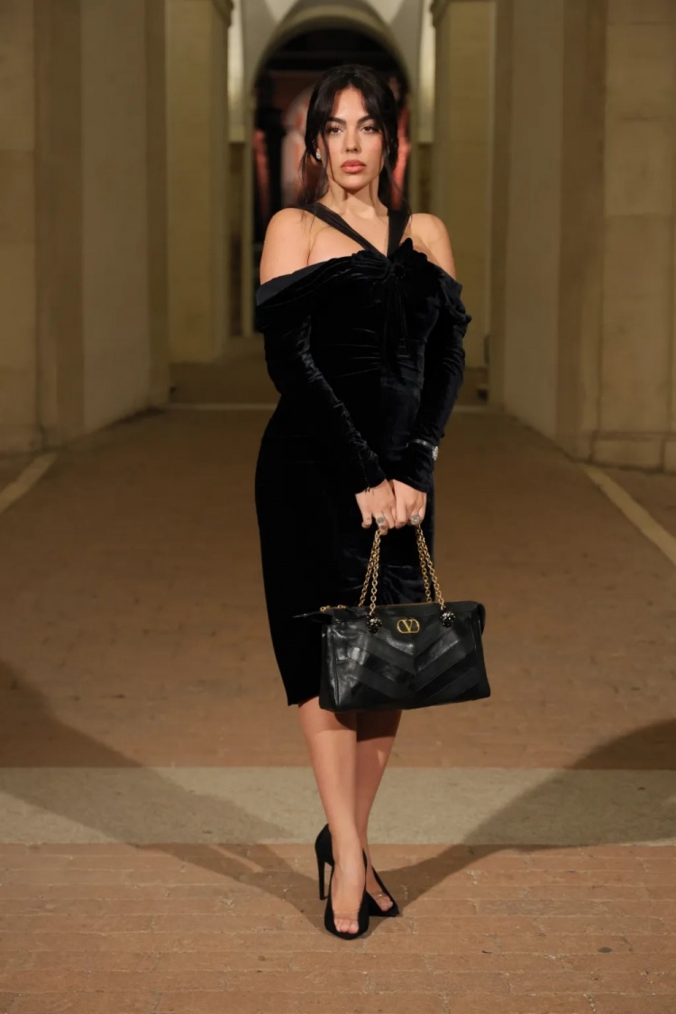 32岁的乔治娜身着引人注目的黑色天鹅绒连衣裙,摆拍照片。裙长及膝,肩带绕过肩膀。她搭配了黑色高跟鞋和黑色手包,完成了这身造型。